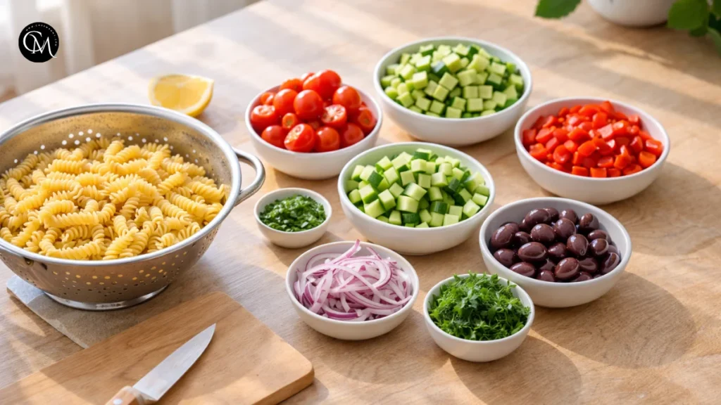 This is where Greek Pasta Salad becomes more than just cold pasta with vegetables. The goal is contrast. You want the juicy tomatoes against the salty olives, the creamy feta against the crisp cucumber, and the tangy dressing against the mild pasta. Every ingredient should have room to stand out, but none should dominate the bowl.