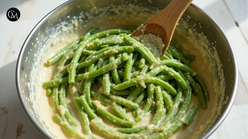 Gently fold the green beans into the creamy mixture, ensuring every piece is coated evenly for consistent flavor.