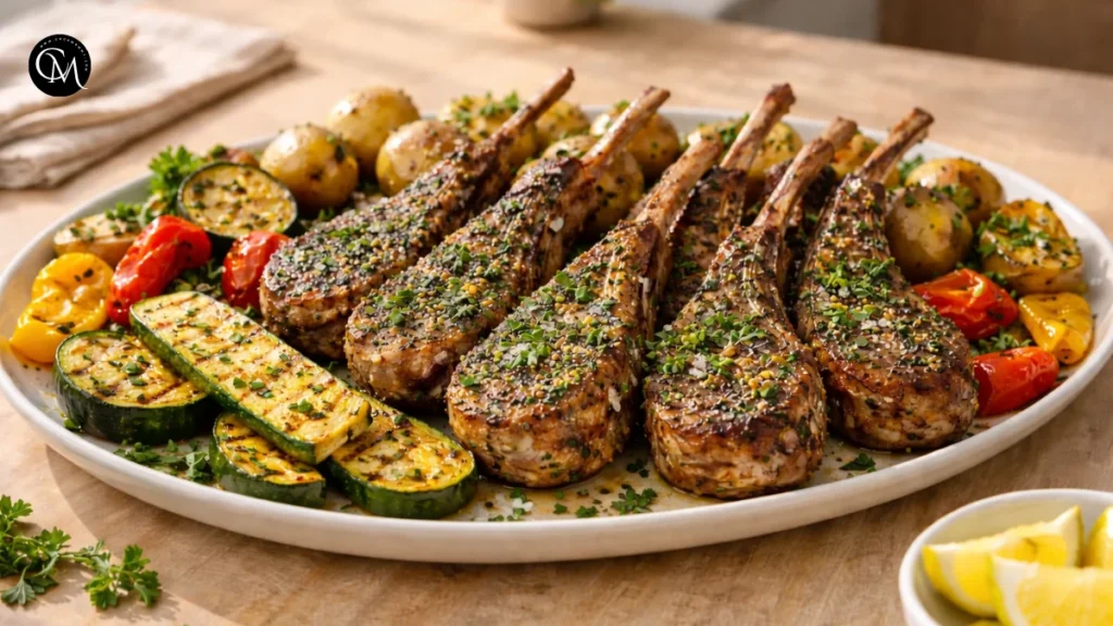 At this stage, all the flavors come together: richness from the lamb, savoriness from garlic, earthiness from herbs, and brightness from lemon. If you are serving the chops with grilled zucchini, charred peppers, or baby potatoes, arrange everything on the same platter. It turns a simple dinner into something that feels restaurant-worthy without extra effort.