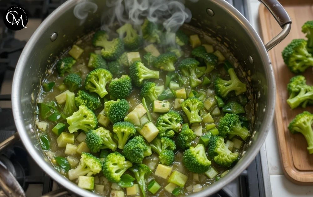 Add the broth and bring to a simmer. Cover and cook for 10–12 minutes, until the broccoli is tender.