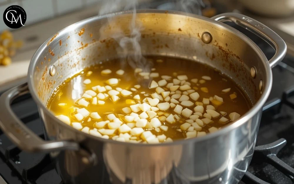 Heat olive oil or butter in a large pot over medium heat. Add onion and garlic, cooking until golden and fragrant (3–4 minutes).