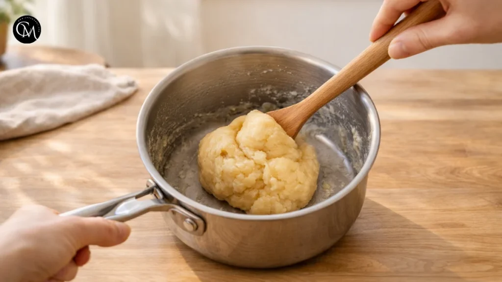 In a medium saucepan, combine water, butter, sugar, and salt. Bring it to a gentle boil over medium heat, stirring so the butter melts evenly. Once it reaches a simmer, add the flour all at once and stir firmly with a wooden spoon until the dough pulls away from the sides and forms a soft ball.