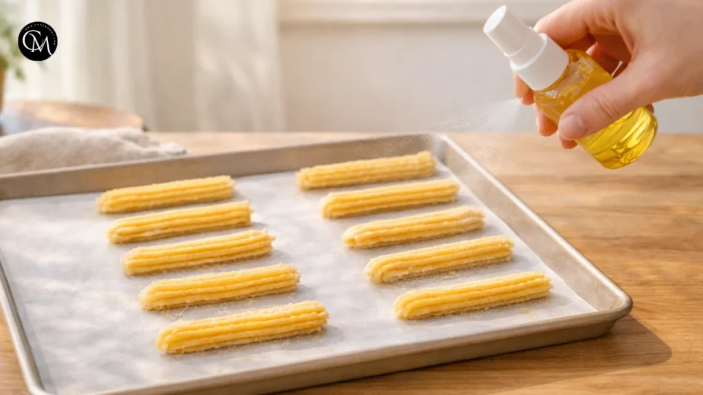 Texture depends on this step. Too much added oil makes them heavy, while too little can keep them from browning well. A light coating is enough. Bake for 12 to 15 minutes, or air fry for 10 to 12 minutes, until the churros are golden and crisp on the edges.