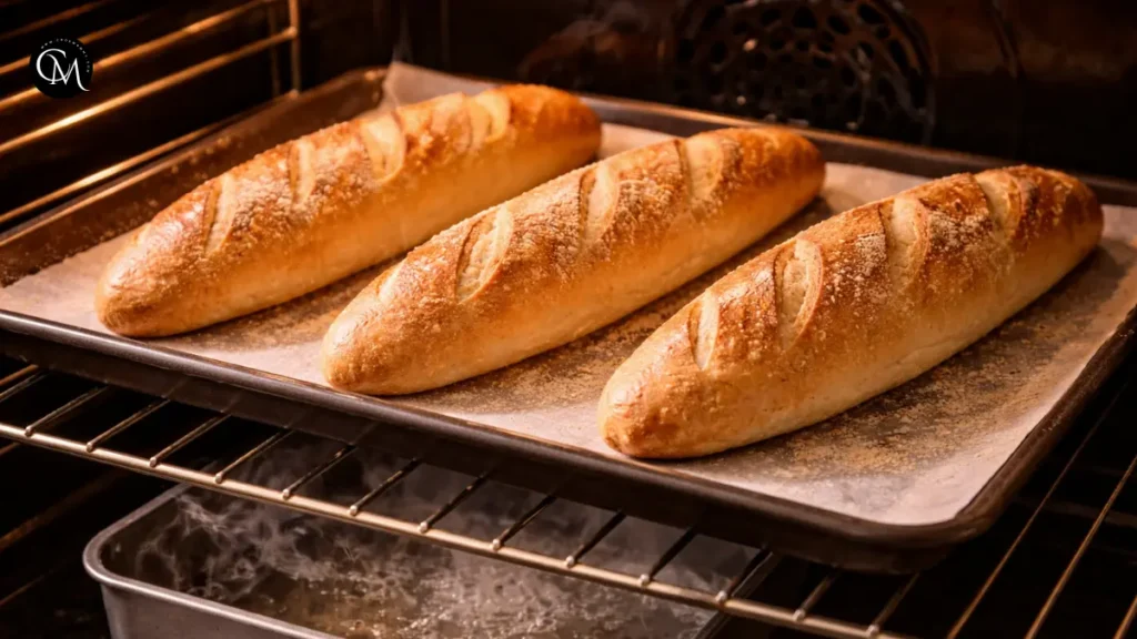 Preheat oven to 475°F (245°C). Set a heatproof pan filled with hot water on the oven’s bottom rack to create steam. Bake baguettes for 20–25 minutes until golden brown.