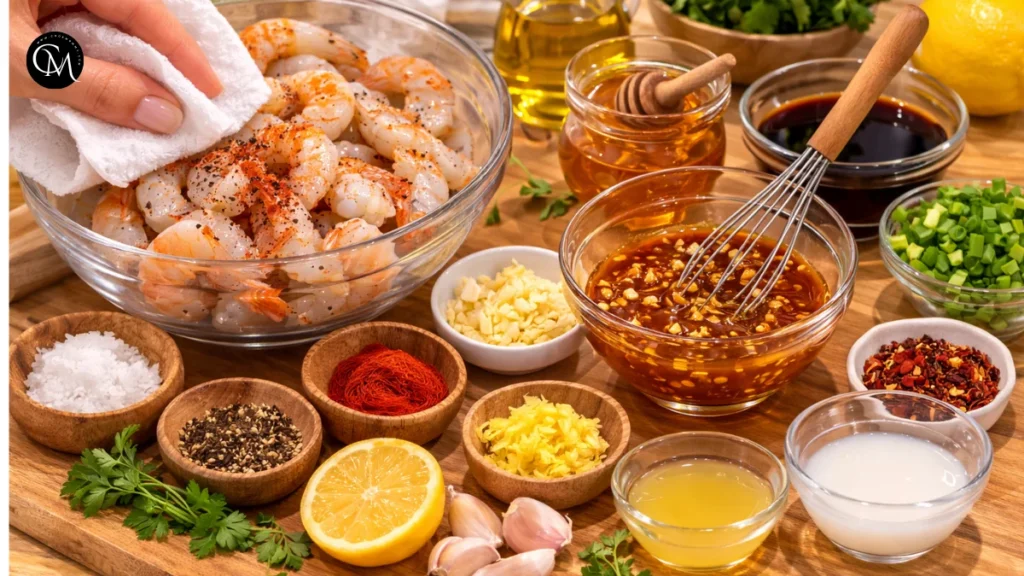 Start by patting the shrimp dry with paper towels. This part of the process has a bigger impact on the final result than most people expect. Wet shrimp release moisture into the pan, which can make them steam instead of sear. Dry shrimp cook more evenly and develop better surface color.