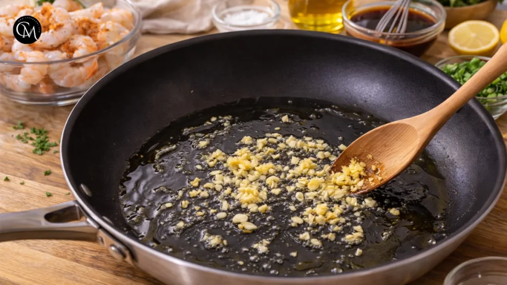 Place a large skillet over medium-high heat, then pour in the oil once the pan is warm. Once the oil is shimmering, reduce the heat slightly and add the garlic and ginger for about 20 to 30 seconds if you want a stronger aromatic base before the shrimp goes in. Be careful here. Garlic burns fast, and burnt garlic can turn the whole sauce bitter.