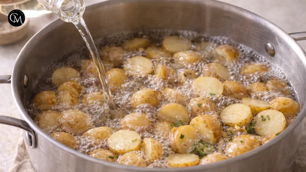 Place halved baby potatoes in a large pot, cover with salted water, and bring to a boil. Cook for 10–12 minutes until fork-tender. Drain and let cool slightly. Pro Tip: Adding a splash of vinegar to the cooking water helps potatoes keep their shape.