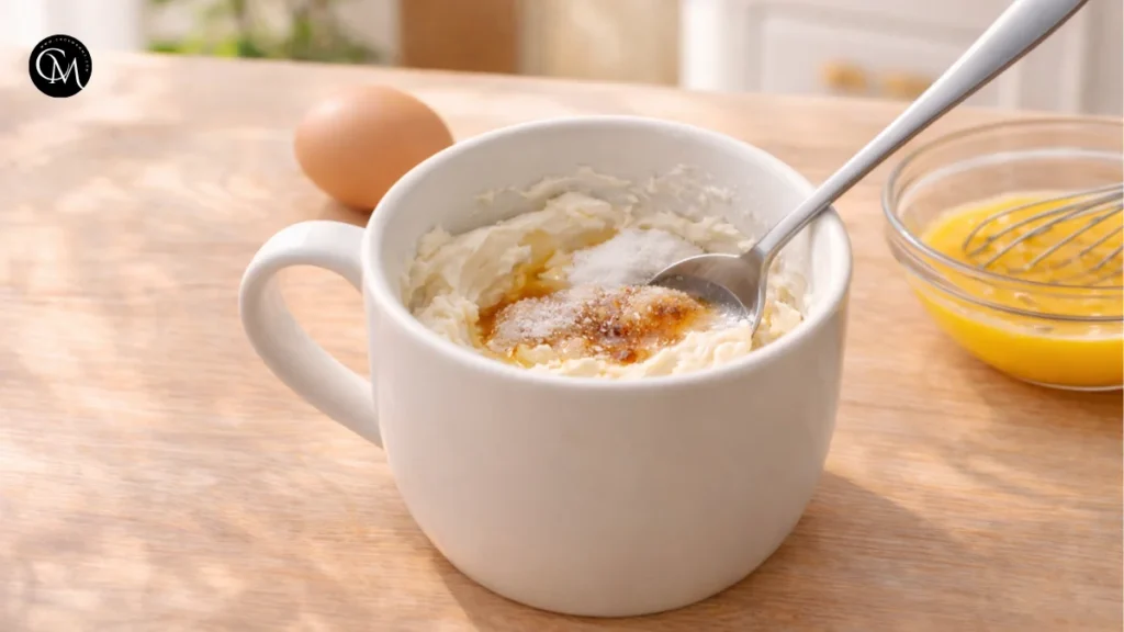 In a microwave-safe mug, beat the softened cream cheese until creamy. Add sweetener, vanilla, and salt. Mix thoroughly before incorporating the egg.