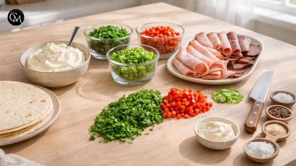 Start by softening the cream cheese so it blends smoothly. Chop the spinach, bell pepper, and green onions into small, even pieces. If your deli meat slices are very large, trim them slightly so they fit the wrap without bunching.