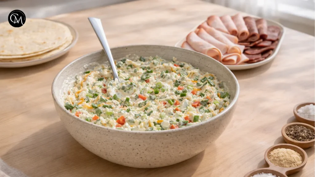 This step builds the flavor foundation. Cream cheese acts as both the binder and the moisture base, while mustard adds brightness and keeps the filling from tasting flat. The shredded cheese adds body, which helps the filling stay firm after chilling. That balance is what gives Keto Pinwheel Sandwiches their creamy but sliceable texture.