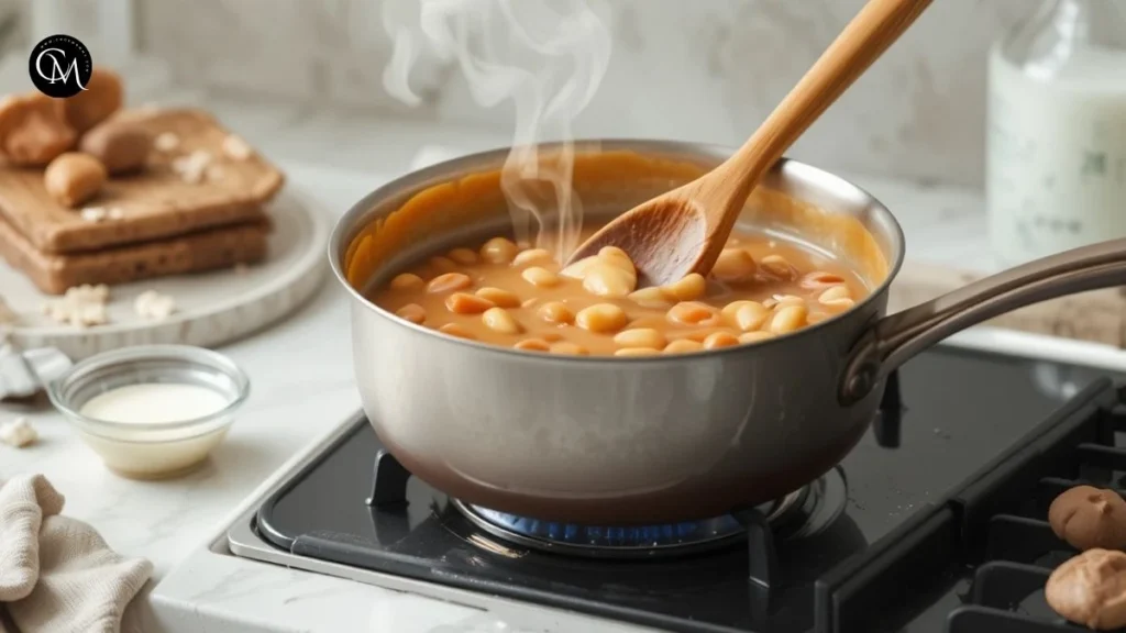Over low heat, melt the caramel with the remaining 2/3 cup evaporated milk, stirring constantly, until smooth.