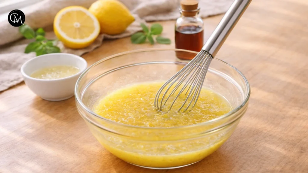 In a medium bowl, whisk together the fresh lemon juice, lemon zest, sugar, and vanilla extract until the sugar dissolves completely. The mixture should smell bright and fragrant, with no gritty texture.
