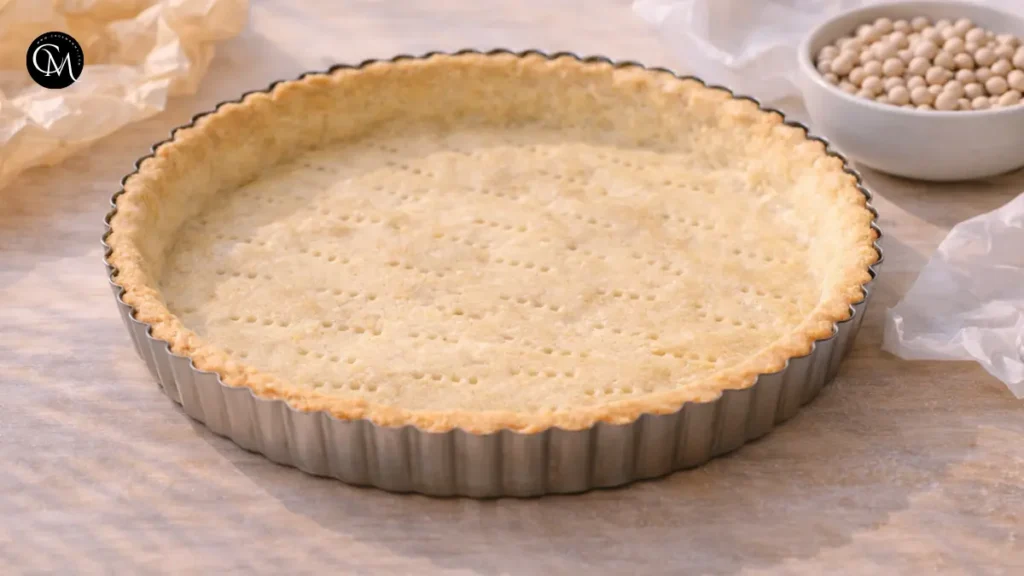 Roll the dough to fit a 9-inch tart pan, gently press it in, and remove any excess around the rim. Prick the bottom with a fork. Cover the crust with parchment and add baking weights to keep it from puffing up. Bake at 375°F (190°C) for 15 minutes. Remove the weights and bake for 10 more minutes, or until the crust turns a light golden hue.