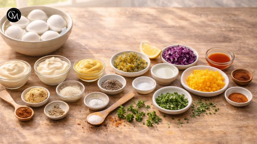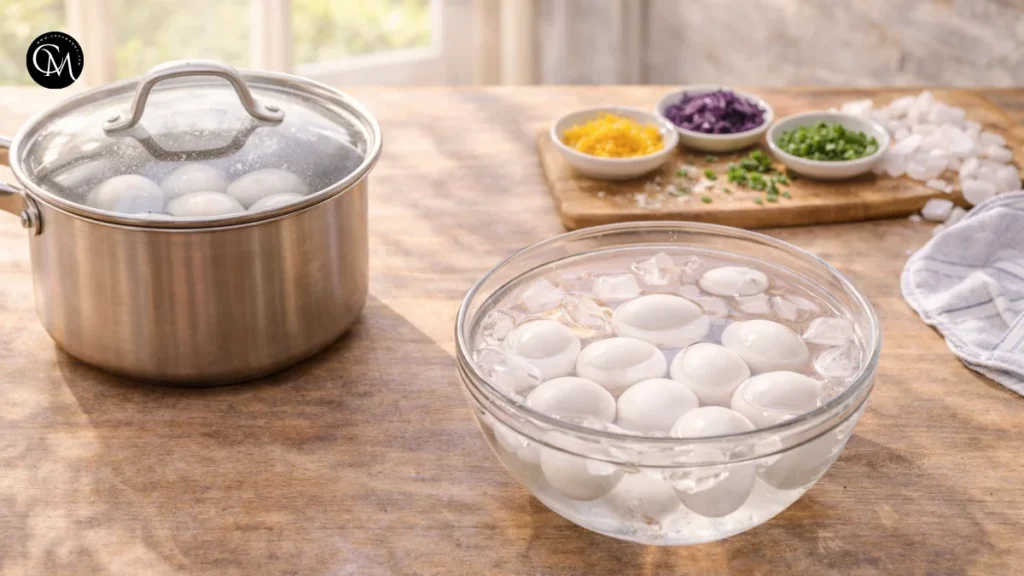 Preparation matters here more than people think. Overcooked eggs can develop a gray-green ring around the yolk and a sulfur smell that dulls the overall flavor. While the eggs cook, set up an ice bath and chop your garnishes so assembly goes smoothly later.