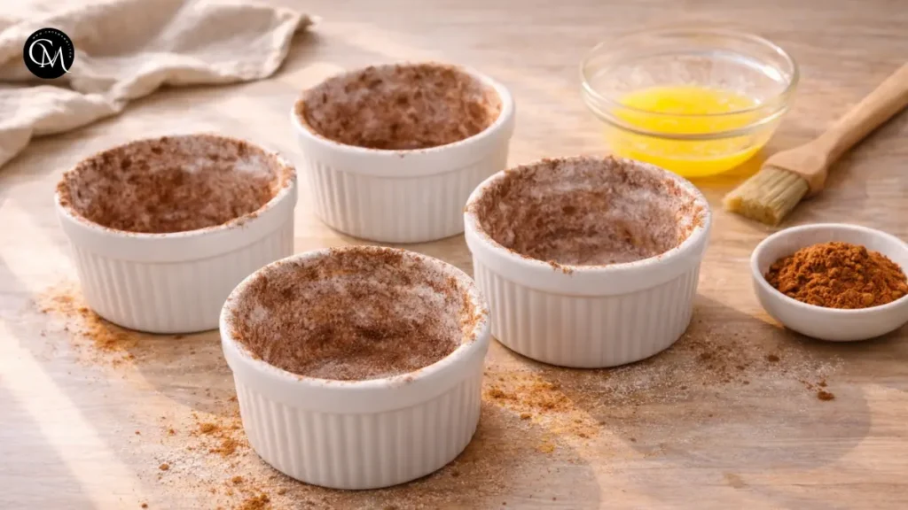 Preheat your oven to 180°C (350°F). Lightly grease ramekins with butter or a spritz of coconut oil, then dust them with flour or cocoa powder to prevent sticking.