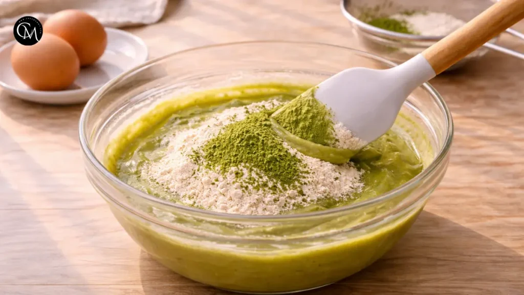 Sift the flour and matcha powder together, then gently fold them into the wet ingredients using a spatula. Avoid overmixing to keep the fondant tender.