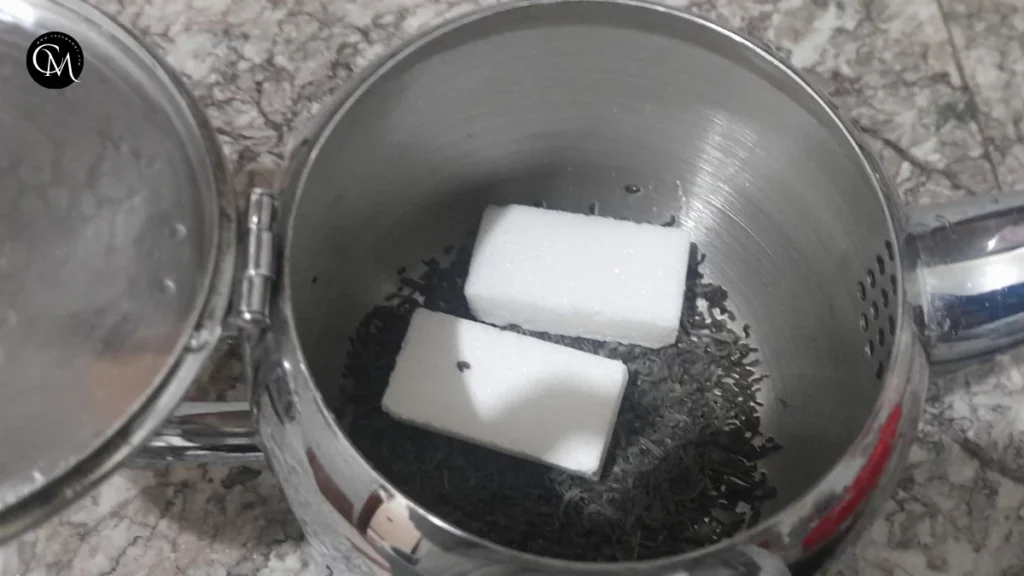 Add sugar directly into the teapot before pouring water. Traditional Moroccan tea is intentionally sweet to balance the sharpness of green tea.