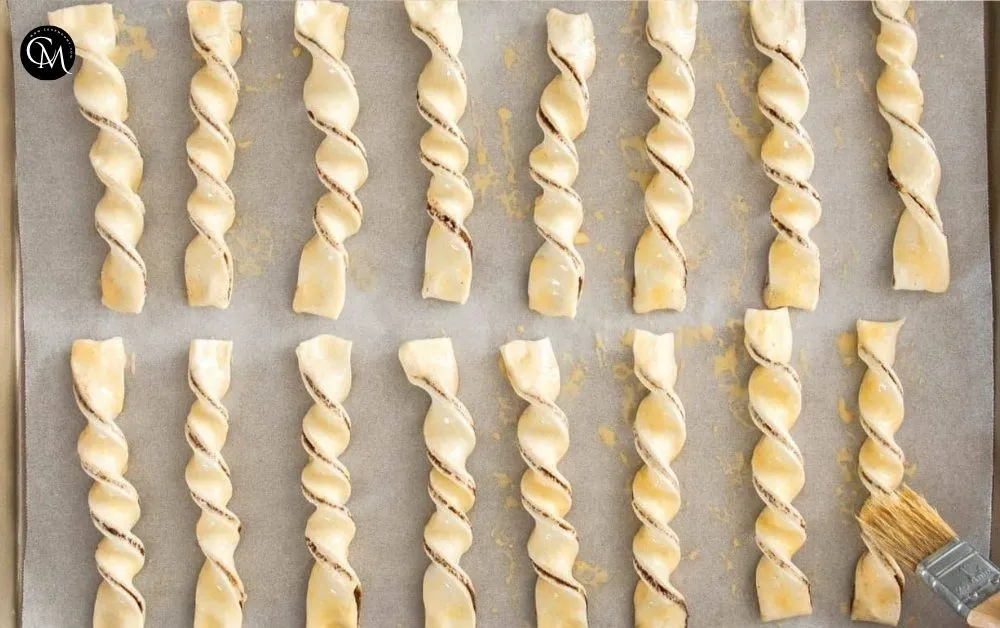 Cut the pastry into 1-inch strips with a sharp knife or pizza cutter. Twist each strip gently several times and lay them on a parchment-lined baking sheet.