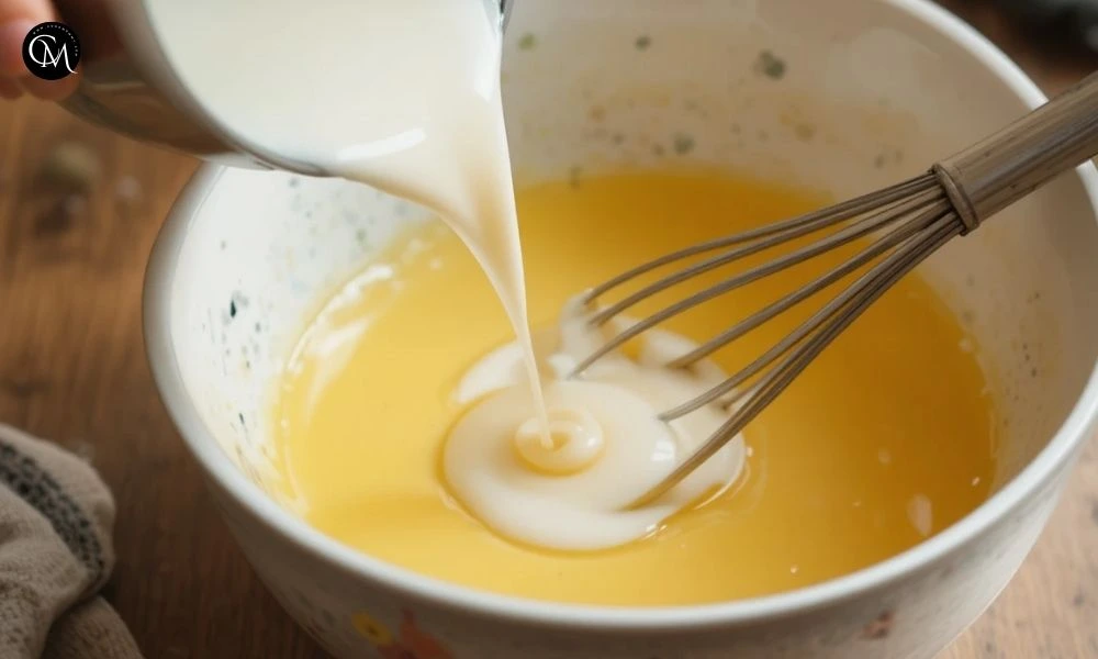 Slowly pour half the warm milk into the yolk mixture while whisking continuously.