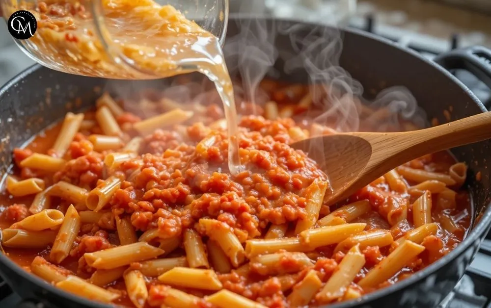 Add the cooked penne to the skillet, mixing well. Use the reserved pasta water to loosen the sauce and create a silky texture.