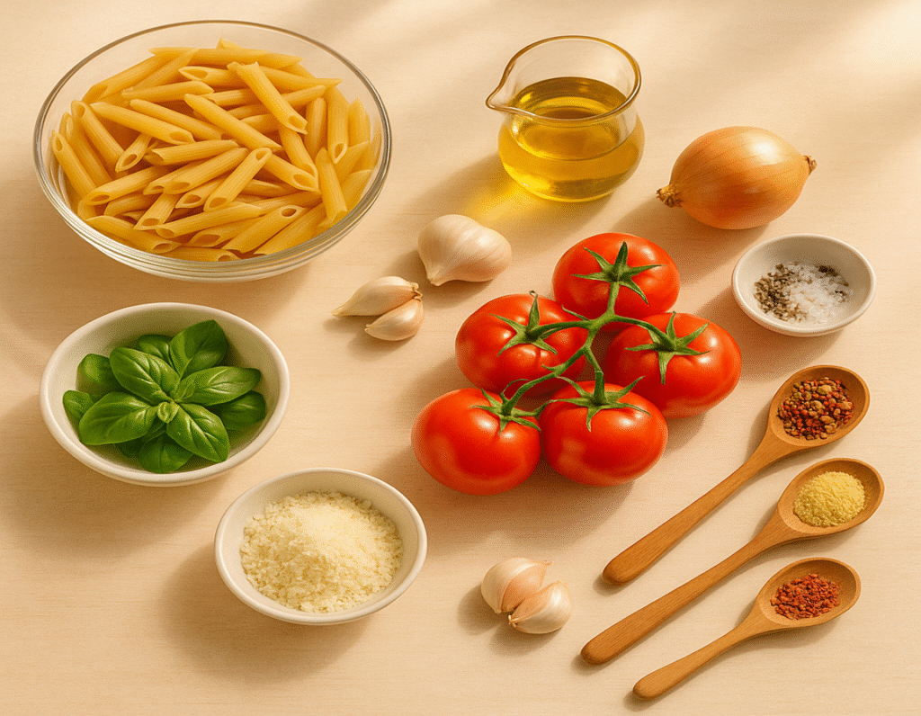 The beauty of Penne Pomodoro lies in its simplicity: ripe tomatoes, perfectly cooked pasta, and fragrant herbs. To keep the dish lighter while maintaining flavor, here’s what you’ll need: