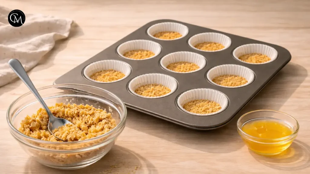 Mix the crushed crackers with melted butter in a bowl, then spoon about a tablespoon into each muffin cup and press down to create a firm crust.