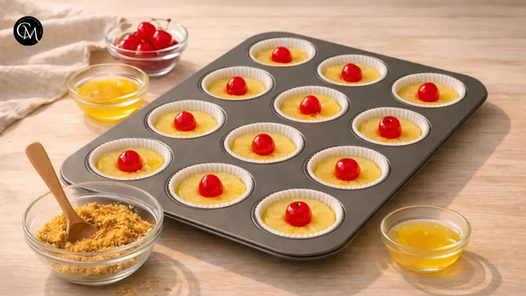 Place 1/2 teaspoon of brown sugar and a few drops of melted butter in each cup. Place a pineapple slice into each cup, trimming the edges as needed, and gently nestle a cherry in the center of each pineapple ring.