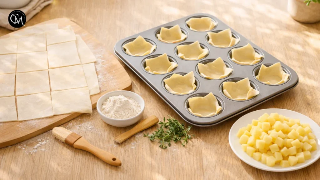 Start by preheating your oven to 400°F (200°C). Coat a 12-slot muffin tray or small tart pan with a thin layer of oil or butter. Roll the puff pastry on a lightly floured surface just enough to smooth it, then cut it into 12 squares or circles. Press each piece gently into the cups.