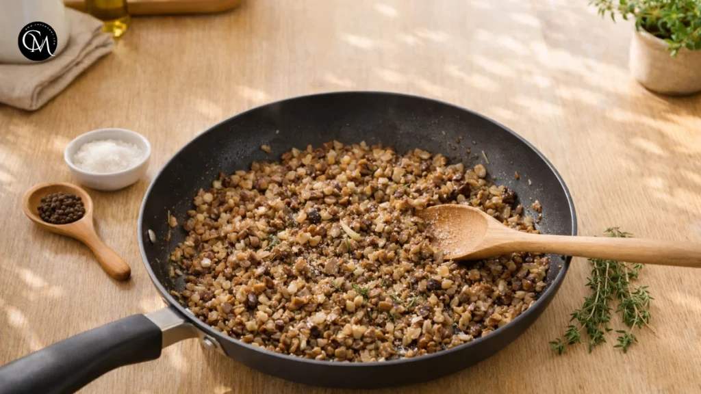In the beginning, the mushrooms will give off quite a bit of moisture. Keep cooking. This is where patience pays off. Once the water cooks away, the mushrooms begin to brown and their flavor becomes much deeper. That transformation is one of the secrets to a great Potato and Mushroom filling. If you stop too early, the mixture tastes pale and watery. If you let it cook properly, the flavor becomes savory, concentrated, and almost meaty.