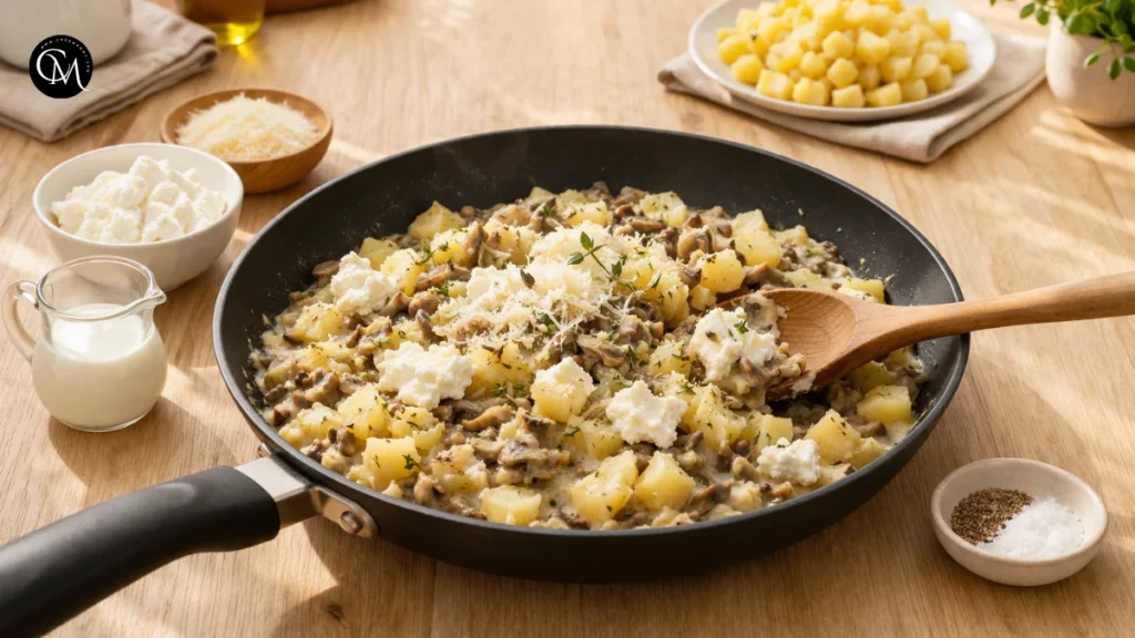Add the cooked potatoes to the mushroom mixture and stir gently. Use your spoon to break some of the potato cubes slightly while leaving enough pieces intact for texture. Fold in the ricotta, Parmesan, and milk.