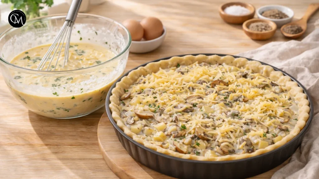 This step is all about balance. Eggs give structure, cream brings silkiness, and cheese adds both flavor and body. Nutmeg may seem small, but it quietly rounds out the richness. Make sure the filling is distributed evenly so every bite gets potato, mushroom, and custard together. That even layering is what makes a good quiche feel intentional and well-made.