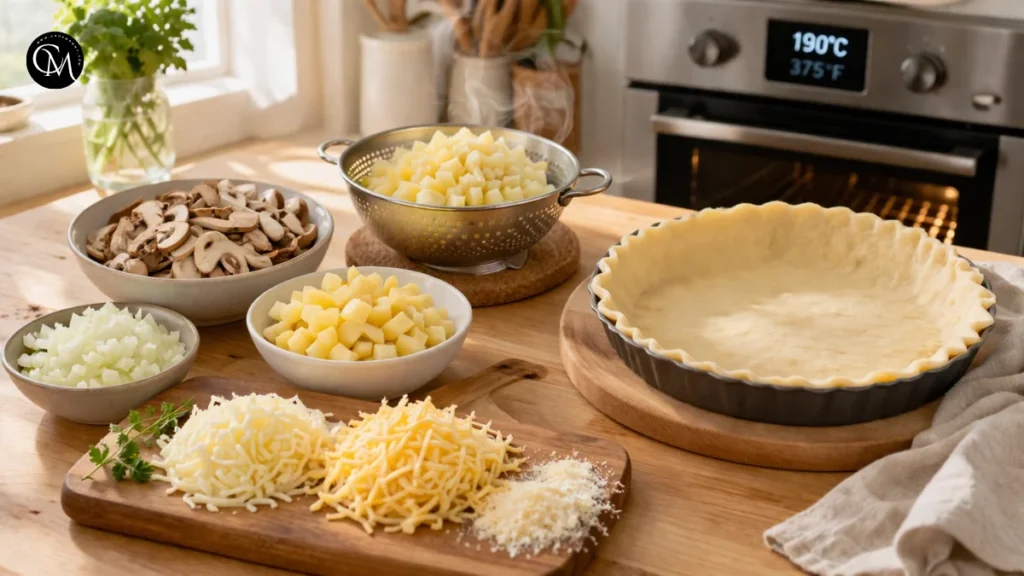 Preheat your oven to 190°C (375°F). Roll the crust into a 9-inch pie or tart pan, press it in gently, and chill it while you prepare the filling. Dice the potatoes into small, even cubes and slice the mushrooms. Finely chop the onion and grate the cheese.