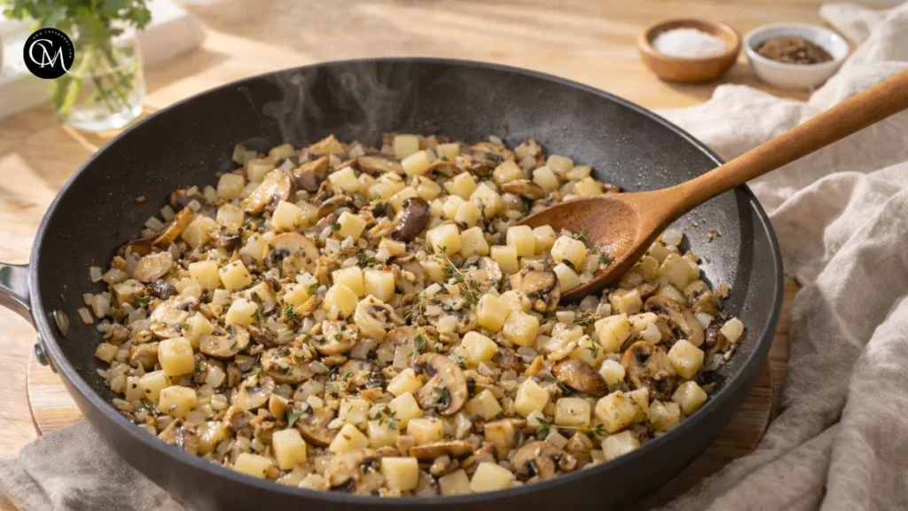 This is the point where texture comes together. Potatoes can be mild on their own, so giving them a few minutes in the pan helps them pick up seasoning before they disappear into the custard. I like to keep some potato cubes intact rather than stirring too aggressively. That way, every slice of Potato mushroom quiche has tender bites instead of a mashed filling.