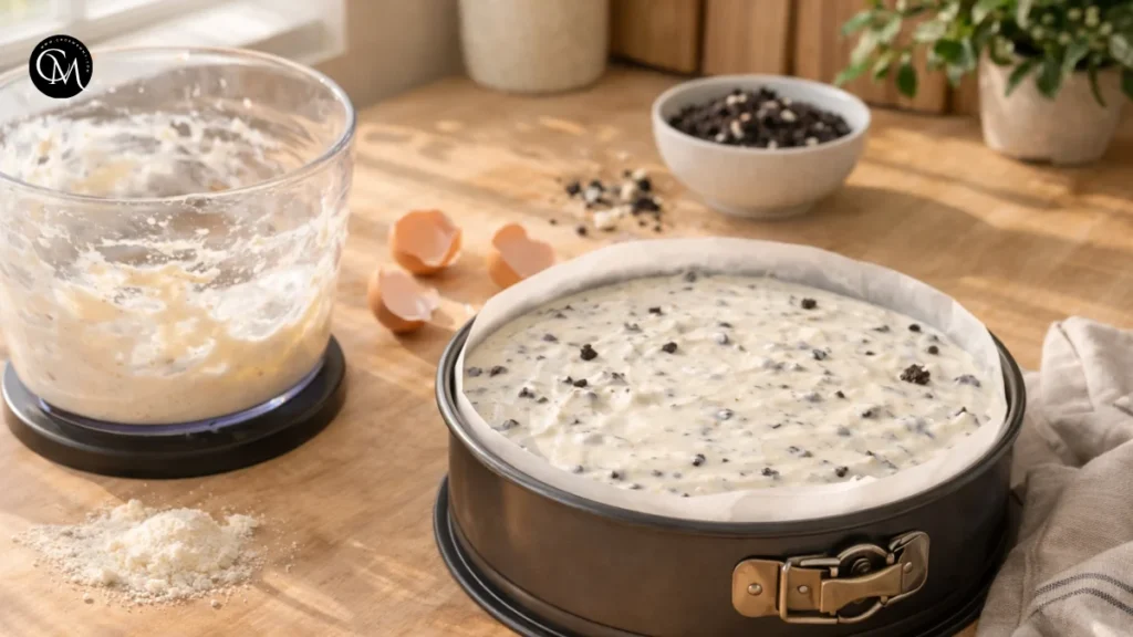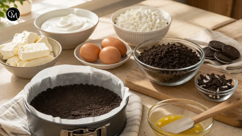 Start by bringing the cream cheese, yogurt, eggs, and cottage cheese close to room temperature. This matters more than people think. Cold dairy creates a lumpy batter, and overmixing to fix it often adds too much air. Pulse the cookies for the crust into fine crumbs, stir with melted butter, and press the mixture into a lined springform pan. Chill the crust while you prepare the filling. When I make Protein Oreo cheesecake, I also crush the cookies for the filling ahead of time so I am not scrambling later with sticky hands and a half-mixed batter.