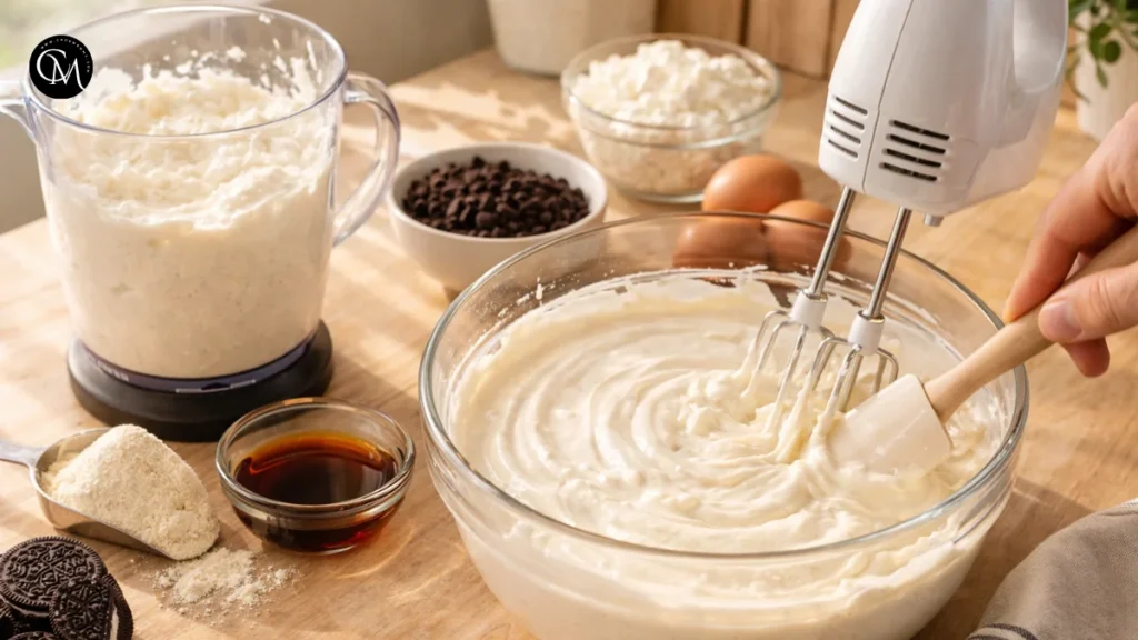 Blend the cottage cheese until smooth before adding it to the bowl. This is the small step that makes the filling taste polished rather than improvised. Beat the softened cream cheese with sugar until creamy, then mix in the yogurt, blended cottage cheese, vanilla, and protein powder. The science here is simple: you are creating a smooth flavor base before the eggs go in. Protein powder can thicken quickly, so add it gradually and scrape the bowl well. A well-mixed base gives Protein Oreo cheesecake its creamy structure without a chalky finish.