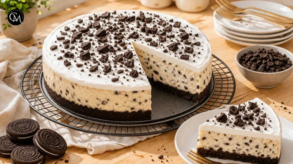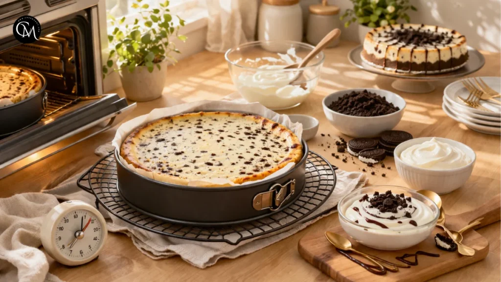 Before serving, spread a thin layer of Greek yogurt or whipped topping over the surface and scatter with extra cookie crumbs. If the cheesecake tastes flatter than expected, a tiny pinch of salt can sharpen the flavor. That is one of my favorite dessert tricks. Salt does not make it salty; it makes vanilla, chocolate, and cream cheese taste more alive. For a neater finish, wipe your knife between slices. A clean cut makes homemade Protein Oreo cheesecake look much more professional.