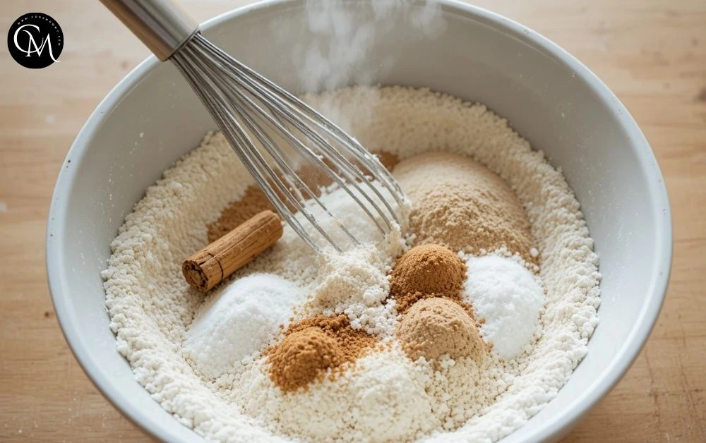 Whisk flour, baking soda, baking powder, salt, and spices in a large bowl. Evenly distributing the leavening agents ensures every muffin rises properly.