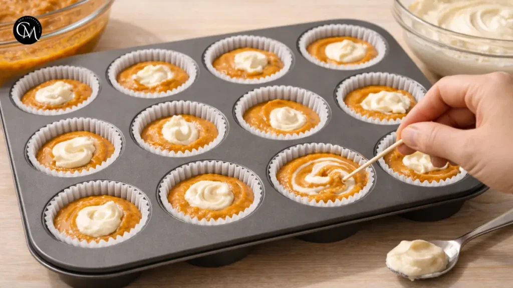 Line a muffin tin with paper liners. Fill each cup two-thirds with pumpkin batter. Spoon on 1–2 teaspoons of the cream cheese mixture and swirl gently with a toothpick.