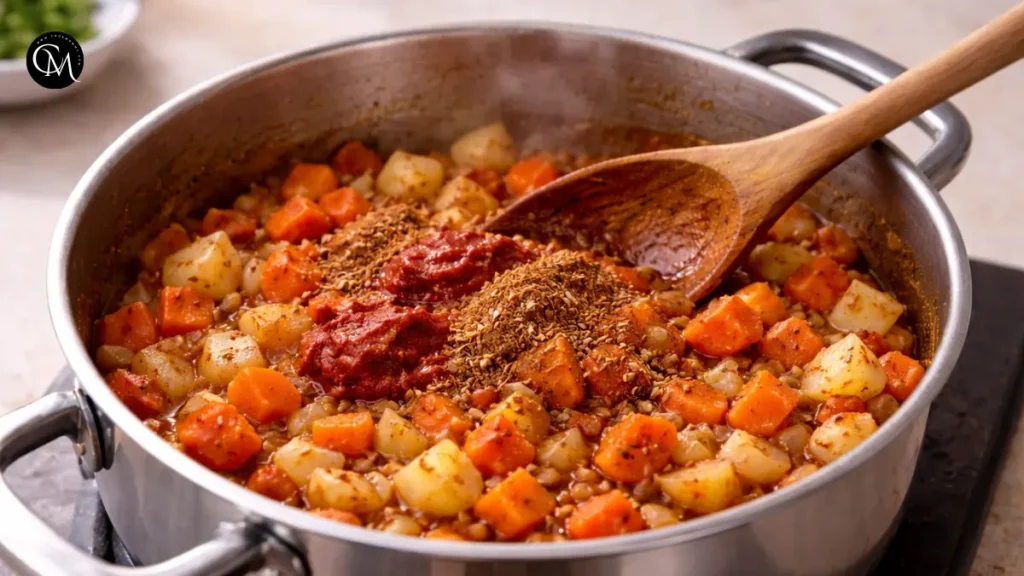 Mix in the tomato paste, cumin, and paprika. Stir to cover the vegetables unevenly with the spices.