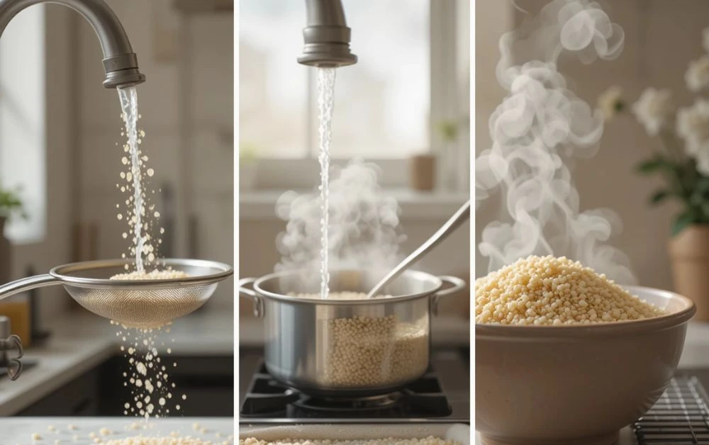 Wash 1 cup of quinoa in cold water. In two cups of water you can cook them until they become soft (about 15 minutes). Let it cool.