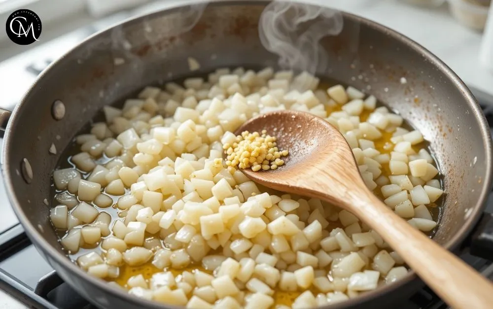 Warm olive oil in a large skillet. Add the onion and cook until translucent, about 3–4 minutes. Stir in garlic and cook for another minute to release its aroma.