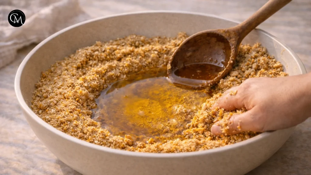 - Stir with a rustic ladle or your hands until the admixture starts to come together. It’ll originally appear crumbly continue kneading in the coliseum until a cohesive, thick paste forms. Acclimate the honey for your preferred agreeableness