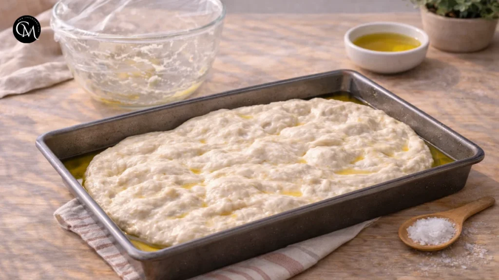 Do not wait only for the clock. Watch the dough. This matters because overproofed focaccia can collapse, while underproofed dough bakes up dense. A well-fermented dough will look lively, with bubbles forming at the sides and surface.