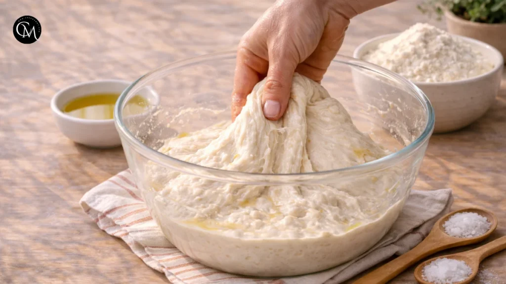 Now begin a series of stretch-and-folds over the next 1 to 2 hours. Every 30 minutes, wet your hand, lift one side of the dough, and fold it over itself. Turn the bowl and repeat a few times. You are not kneading in the traditional way. You are building structure while preserving the dough’s moisture.