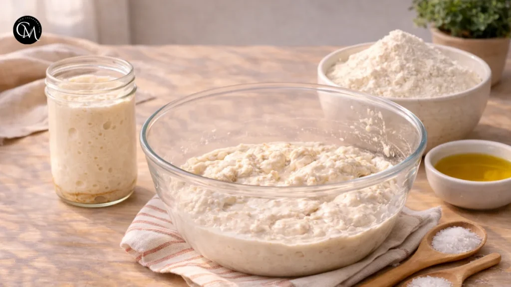 This is where the cooking science becomes useful. Salt strengthens gluten, olive oil contributes tenderness and flavor, and gentle folding organizes the dough without knocking out fermentation. When I first started baking focaccia, I assumed more kneading meant better bread. In reality, Sourdough Focaccia Bread improves when you handle it with patience rather than force.
