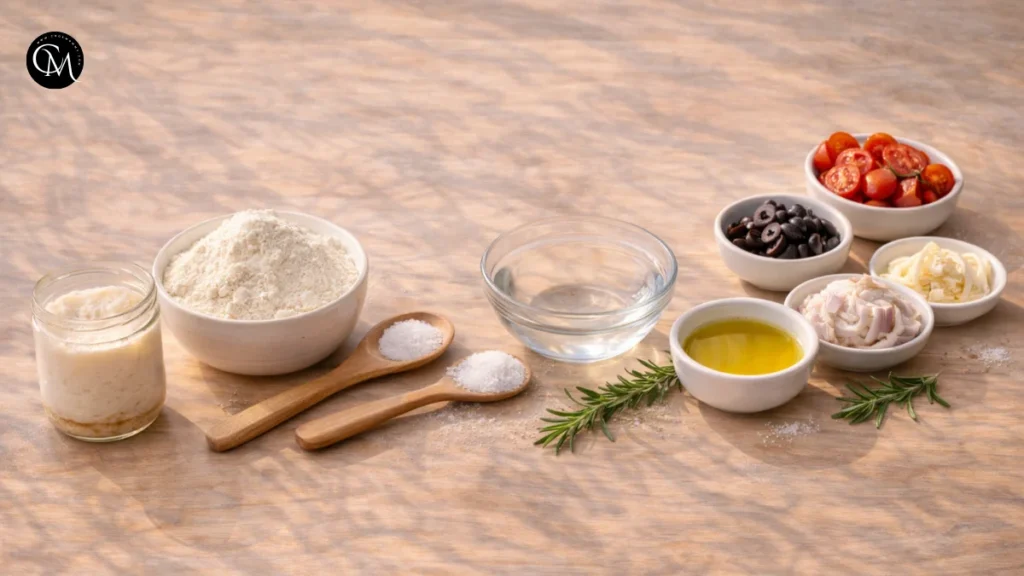 Measure everything before mixing. This matters more than many people think. Focaccia dough is wetter than standard sandwich bread dough, so it can feel sticky and messy if you try to improvise. Having your flour, water, salt, and olive oil ready helps you move with confidence instead of rushing and adding extra flour too soon.
