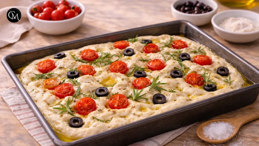 Now add your toppings. Flaky salt and rosemary are classic, but cherry tomatoes, olives, or thin onion slices also work beautifully. Keep the toppings balanced. Too many wet toppings can weigh the surface down, while too little seasoning can make the bread taste flat.
