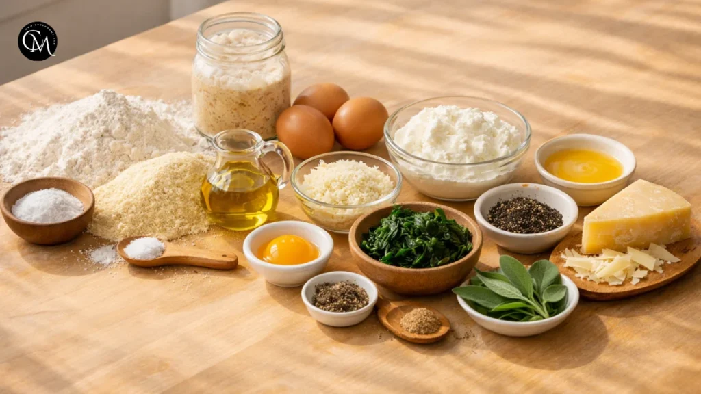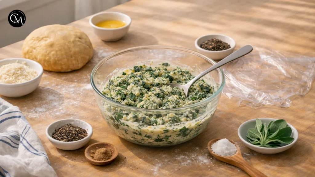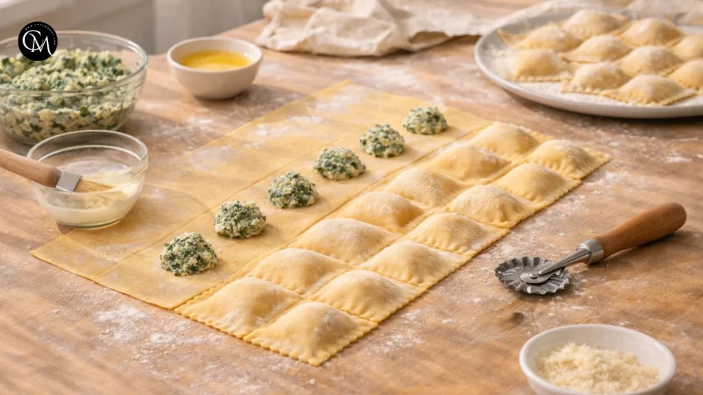 Start by measuring everything before mixing. This sounds simple, but good ravioli is built on small details. If the ricotta seems watery, drain it well, press the moisture out of the spinach, and keep extra flour nearby in case the dough needs balancing.