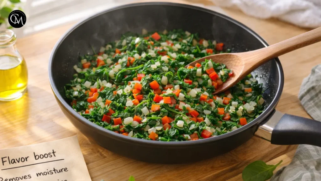 This step is where the flavor improves. Raw vegetables can release too much water in the oven and dilute the taste. Cooking them first helps remove excess moisture and deepens their natural sweetness. The onion becomes mellow, the pepper softens, and the spinach loses that raw bite.