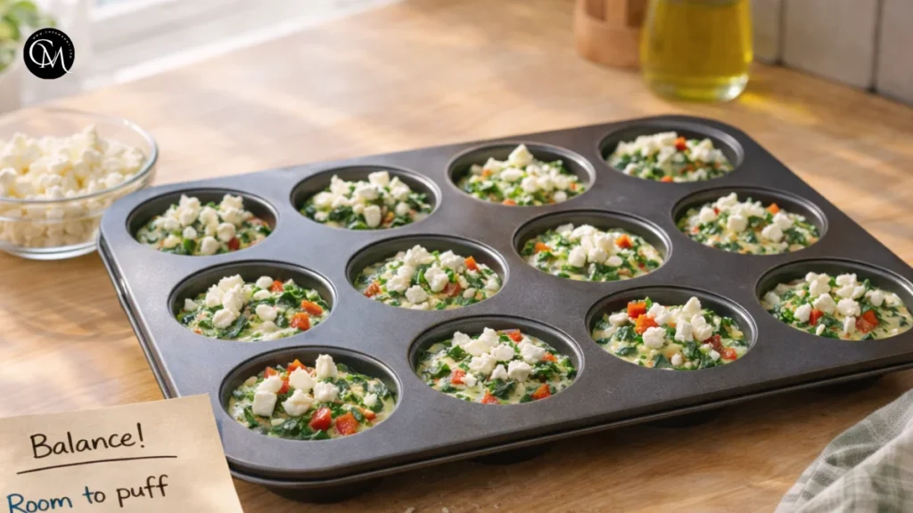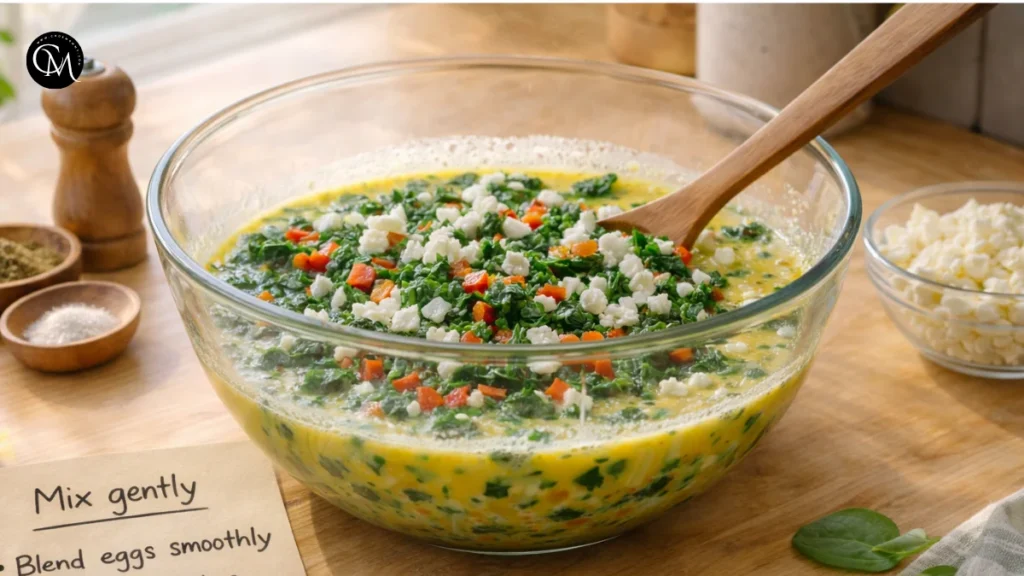 For the best texture, whisk thoroughly but do not overbeat. You want the yolks and whites fully blended so the muffins bake evenly. Overmixing is not a disaster here, but a gentle hand helps keep the result tender. Spinach and Feta Egg Muffins should feel light, not rubbery.